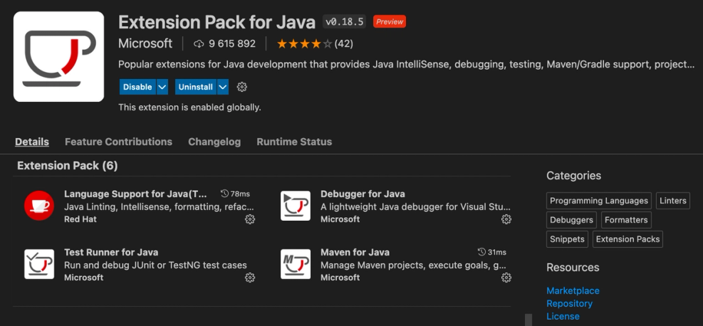 Jeg kommer til å bruke Visual Studio Code som teksteditor i denne artikkelen. Bakgrunnen for dette er at den er er gratis, enkel i bruk og modulær. Visual Studio Code kan brukes til alt av utvikling og tekstredigering og det er stor sjanse for at den kan bli gjenbrukt til andre prosjekter. En av de store fordelene med Visual Studio Code er at den baserer seg på extensions (tilvalg). Rett ut av boksen er programmet i bunn og grunn et veldig fancy tekstredigeringsprogram. Ønsker du å bruke Visual Studio Code til å programmere i for eksempel Java så kan du installere en extension som gir deg kodenavigering, auto-fullføring, syntax-highlightfng, refaktorering, debugging og mye, mye mer. Dersom du ikke allerede har installert extension for Java så anbefales Extension Pack for Java av Microsoft. Den skal dekke alle behovene. Som ekstra tilvalg kan du installere Spring Boot Tools da den gir ekstra validering av Spring-relaterte filer som er praktisk i senere kapitler.