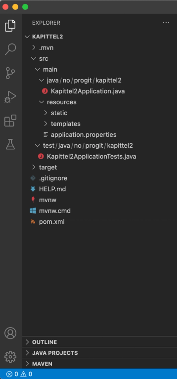 Til slutt vil det i kildekode-mappen din ligge en fil som heter Kapittel2Application.java under mappestrukturen no.progit. Denne klassen inneholder Java sin main-metode som brukes som startpunkt når programmet kjøres. Main metoden har kun én oppgave og den består av å kjøre SpringApplication.run() metoden. Denne metoden vil opprette en Application Context og tilrettelegge alt som trengs for å starte en Spring-applikasjon.