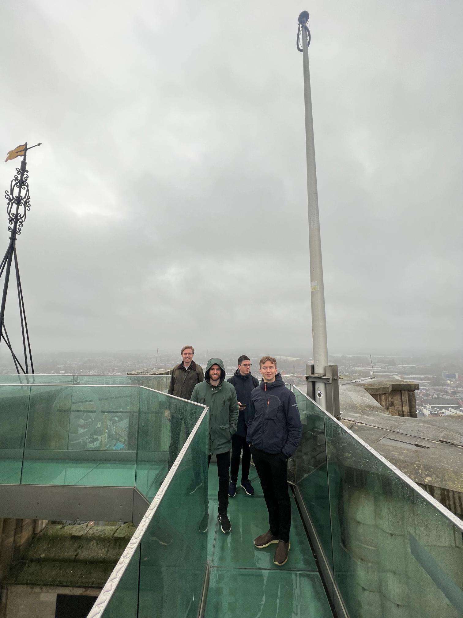 I utganspunktet skulle tårnet ha et 77 meter høyt spir på toppen. Grunnet uviste grunner, ble bare 7 meter av spiret bygget, noe som førte til et flatt tårn. Tårnet er en del av en større kirke, og da vi var på vei opp de 514 trappetrinnene til toppen, møtte vi på en klokkespiller som peste forbi oss på vei opp til kontoret. Akkurat kl 15 satte hun i gang å spille på klokkene. På samme tidspunkt befant vi oss inne i klokketårnet, noe som ga oss tinitus og høy klokkeføring. Til slutt kom vi oss opp på toppen og fikk sett utover deler av Belgia, igjennom skyer og tåke: