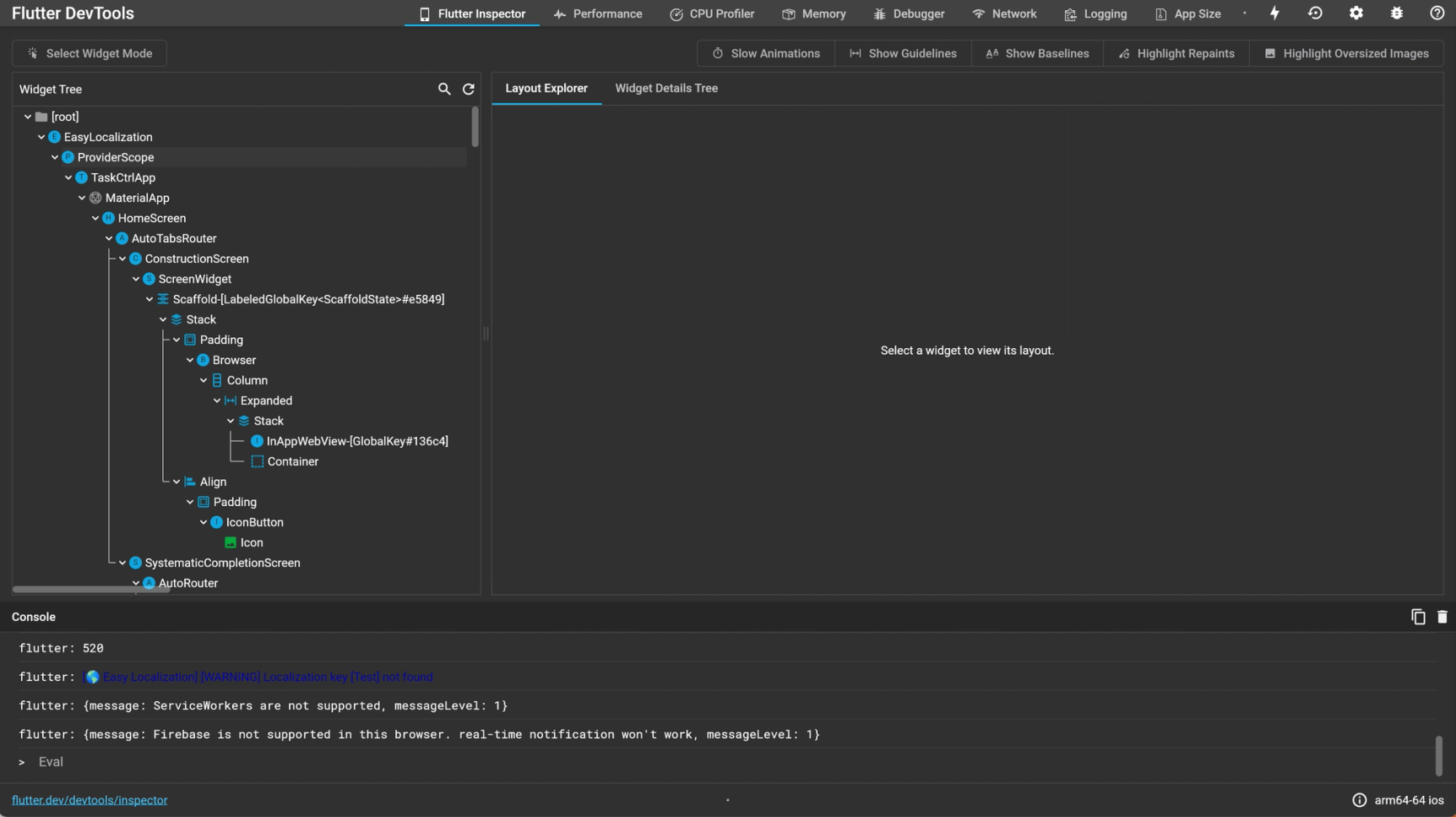 Flutter har også et rikt sett av verktøy for å gjøre det lettere å utvikle. Det finnes plugins for Intellij og VSCode, samt debuggere, profilere og verktøy for å inspisere render treet. Dette gjør utviklingsopplevelsen veldig smud.