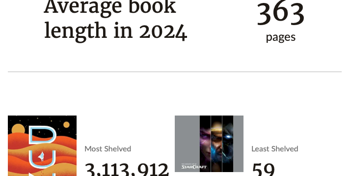 Den lengste boken jeg leste var Dune på 883 sider. Dette var en bok som var en del av Progit sin bokklubb tidligere i år. Både den og oppfølgeren Dune: Messiah ble lest i år i påvente av å se Denis Villeneuve sin filmatisering av science-fiction klassikeren. Dette var en populær bok blant Goodreads-medlemmer også. Over tre millioner andre mennesker "shelved" Dune. Om det betyr at de leste den ferdig er litt uklart.