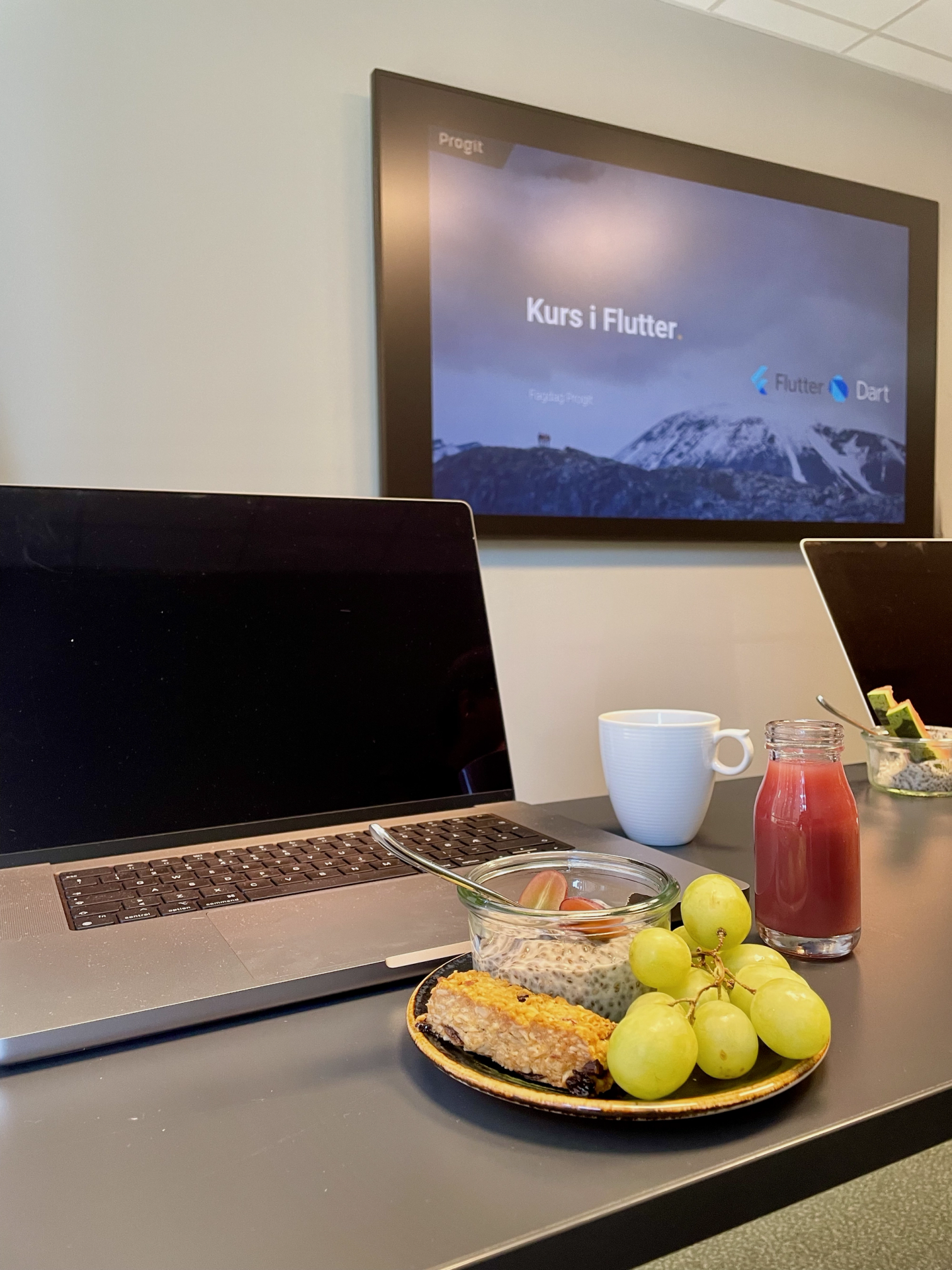 Den store skjermen i konferanselokalet presenterte dagens agenda, nemlig kurs i rammeverket Flutter og det tilhørende programmeringsspråket Dart. Ved siden av skjermen står dagens hovedperson, Progits egen Flutter-ekspert Jesper. I forkant fikk alle deltakerne en detaljert liste med instrukser om oppsett av nødvendig programvare på maskinene. Samtidig som deltakerne koste seg med hotellfrokosten startet Jesper dagen med å introdusere Flutter og sin erfaring med rammeverket. Deretter ble det avslørt hva som skulle bygges denne vakre lørdagen: Progit Activity Booker.