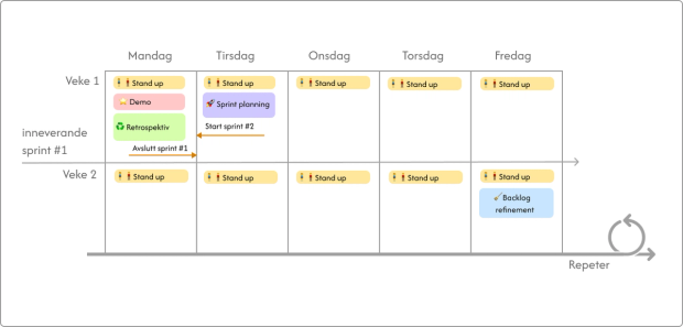 I figuren nedanfor ser de ein oversikt over korleis ein sprint ser ut hjå oss. Ein sprint varar i to veker, og me avsluttar ein sprint på ein mandag, før me startar ein ny sprint følgande tirsdag.