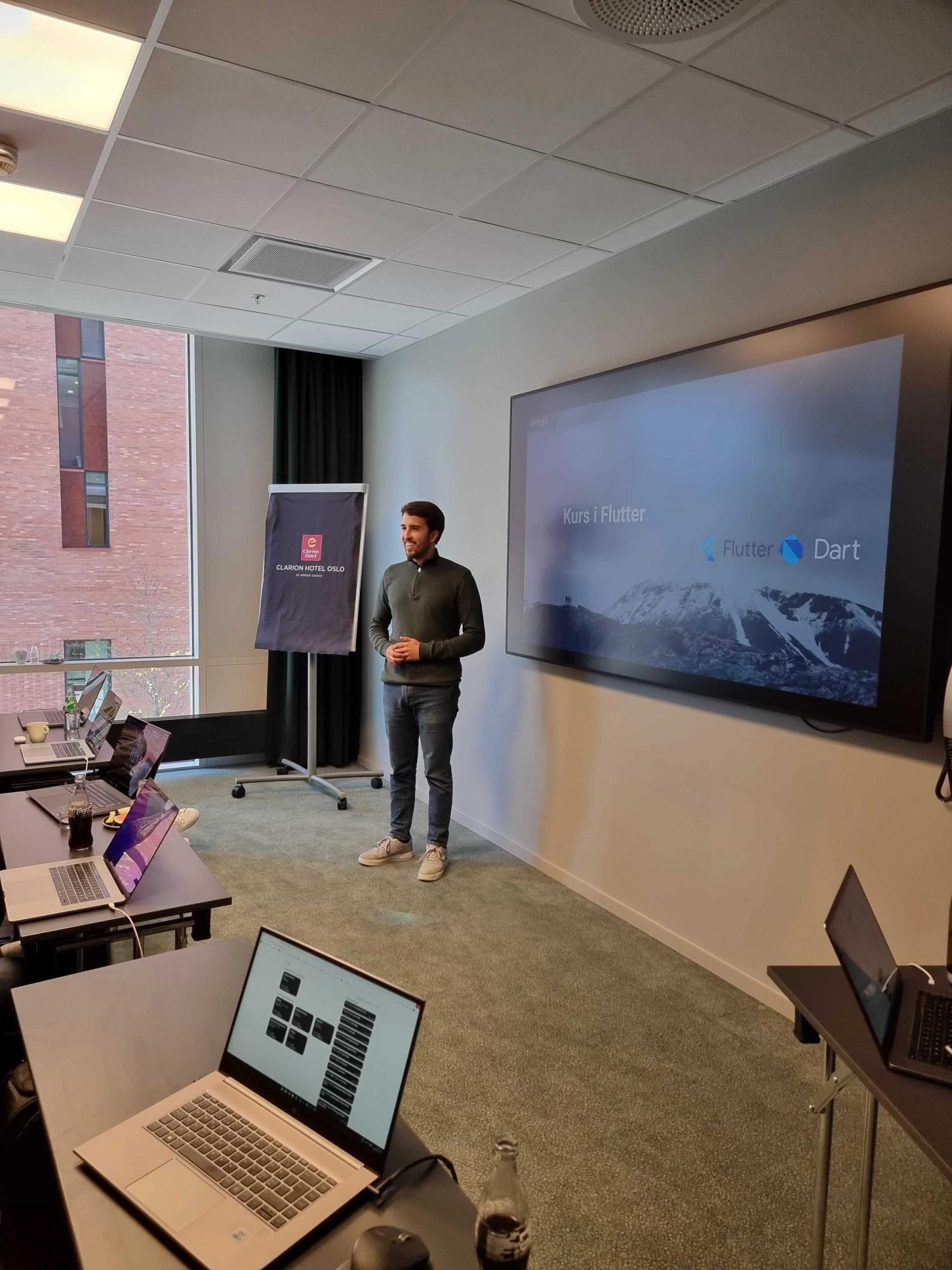 Den store skjermen i konferanselokalet presenterte dagens agenda, nemlig kurs i rammeverket Flutter og det tilhørende programmeringsspråket Dart. Ved siden av skjermen står dagens hovedperson, Progits egen Flutter-ekspert Jesper. I forkant fikk alle deltakerne en detaljert liste med instrukser om oppsett av nødvendig programvare på maskinene. Samtidig som deltakerne koste seg med hotellfrokosten startet Jesper dagen med å introdusere Flutter og sin erfaring med rammeverket. Deretter ble det avslørt hva som skulle bygges denne vakre lørdagen: Progit Activity Booker.