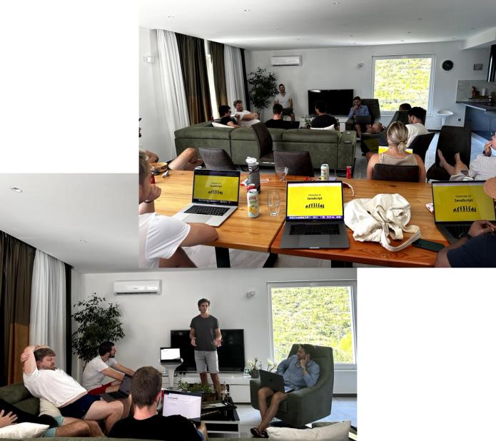 Siden vi tar stolthet i å være dyktige utviklere kunne vi ikke unngå å dyrke den faglige kompetansen vår 🤓 Engasjerte progitere kunne bidra med presentasjoner og workshops fordelt utover hele turen. Erling kickstartet foredragene med å snakke litt om hva som avgjør hvor rask PC-din er, og hvorfor det ofte kan føles som nye datamaskiner er treigere 💻 💾 Videre fortalte Ludvig om developer experience og hvorfor det er viktig for å trives i jobb og levere et godt stykke arbeid 👊 Markus avsluttet sesjonen av presentasjoner ved å ta oss med på en reise gjennom historien til JavaScript. 🧑🏼💻
