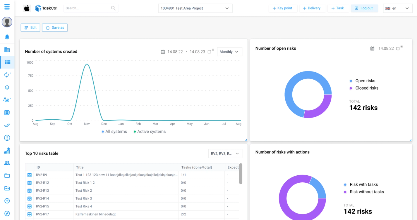 Med disse kravspesifikasjonene i bunn ble årets sommerprosjekt for TaskCtrl, og vi trer med det inn i den etter hvert lange rekken av Progitere som har bidratt til TaskCtrl-kodebasen. 💪 Vårt oppdrag var å lage grunnlaget for et nytt dashboard, med tilhørende nytt API. Dashboardet skulle vise nøkkeltall fra alle prosjektets moduler, og det skulle være mulig for brukere å velge selv hvilke nøkkeltall de vil vise. Den ferdige løsningen kan sees i bildet under.